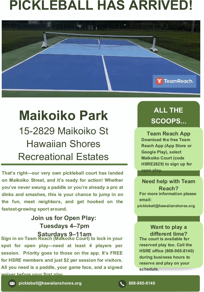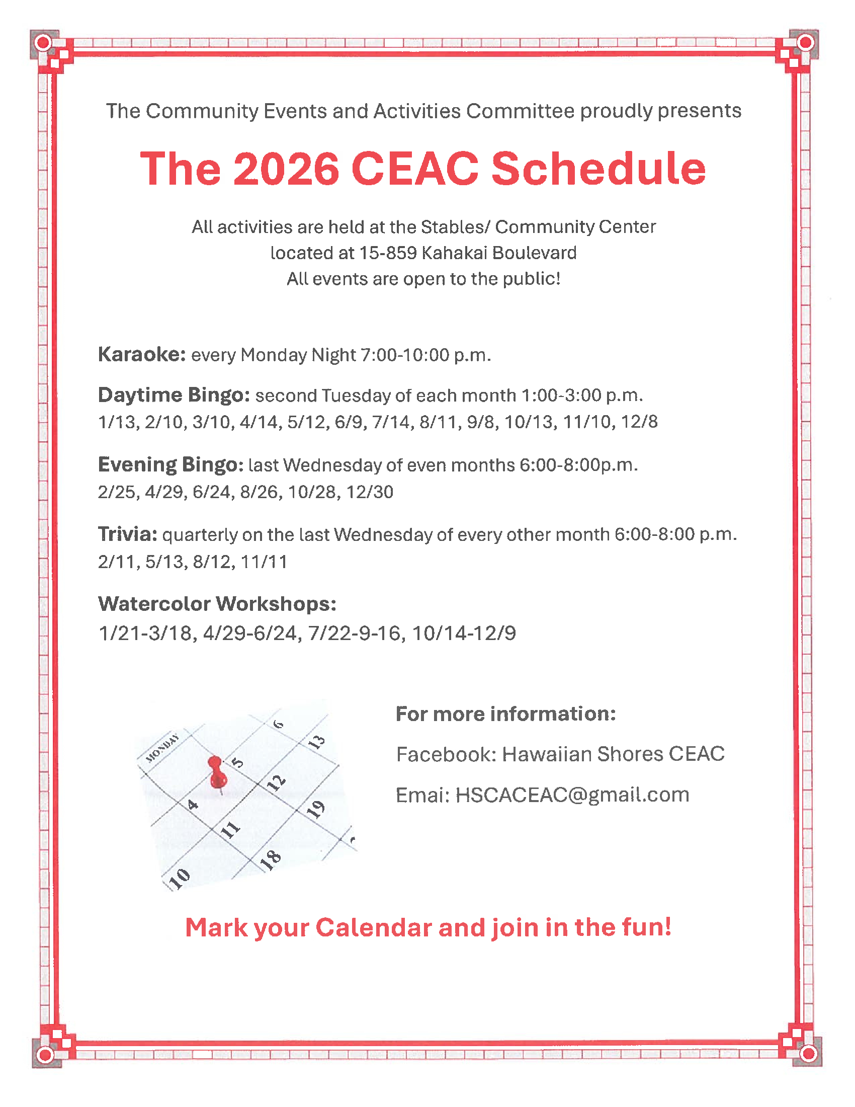 Events & Activities Welcome to the HSCA Events and Activities PageEvents that happen within our community, hosted by HSCA, are posted here.If you would like to host a new community event/activity, please contact the HSCA office at (808) 965-8140 for further inquiries.Mahalo! Honu Park Pool TUESDAY & FRIDAY 10:00 am – 11: 00 amWEDNESDAY & THURSDAY 10:00 – 11:00 am;WATER AEROBICSPlease get in touch with the office to confirm open enrollment.ADULT LAP SWIMTUES, WED, THUR, FRI 8:30 am – 9:30 am;Please get in touch with the office for lane availability. Community Center (Stables) Below are Events & Activities held at the Stables. Click on each image below to learn more.